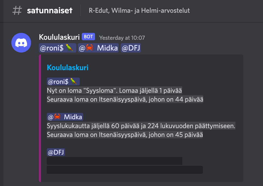 Koululaskuri on erilaisia kouluun liittyviä ajankohtalaskureita tarjoava Discord-botti.